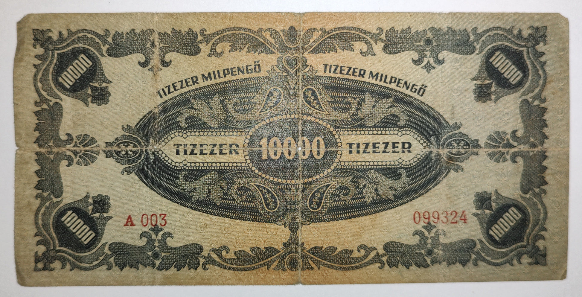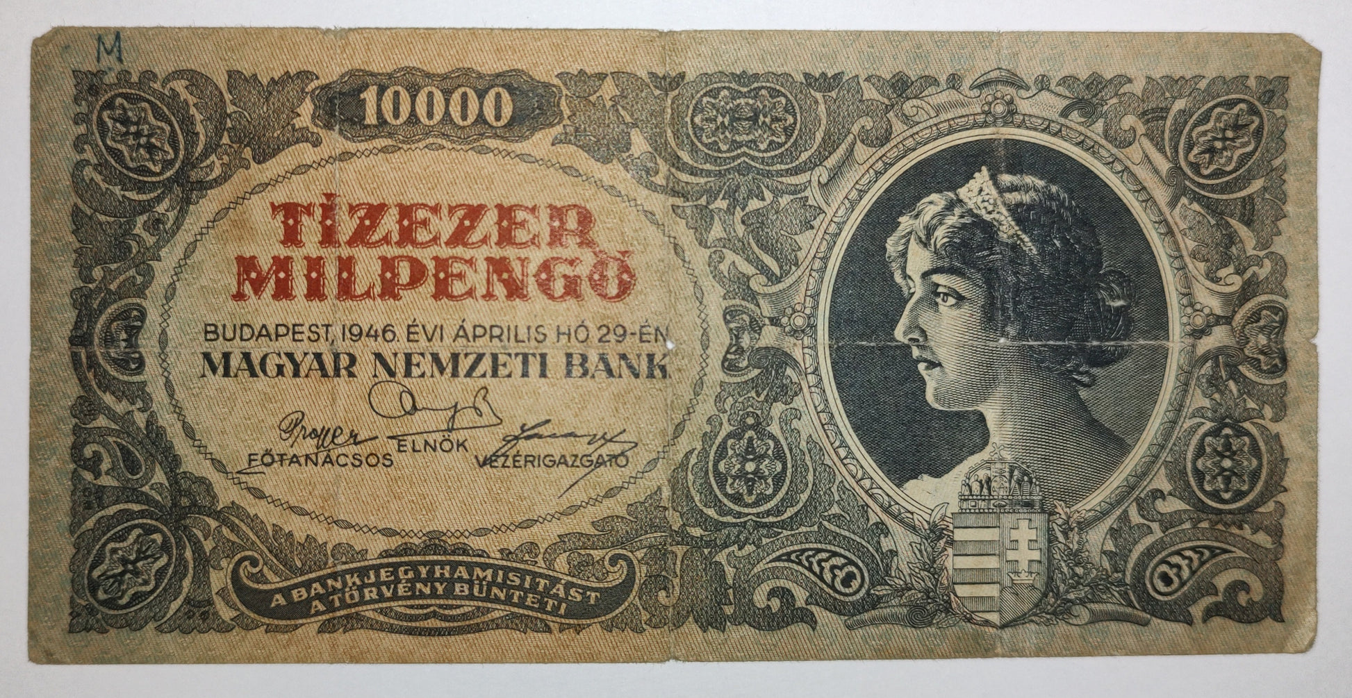 Authentic 1946 Hungary 10000 pengő banknote (P126). Historic currency collectible. Used condition. Perfect for world currency collectors.