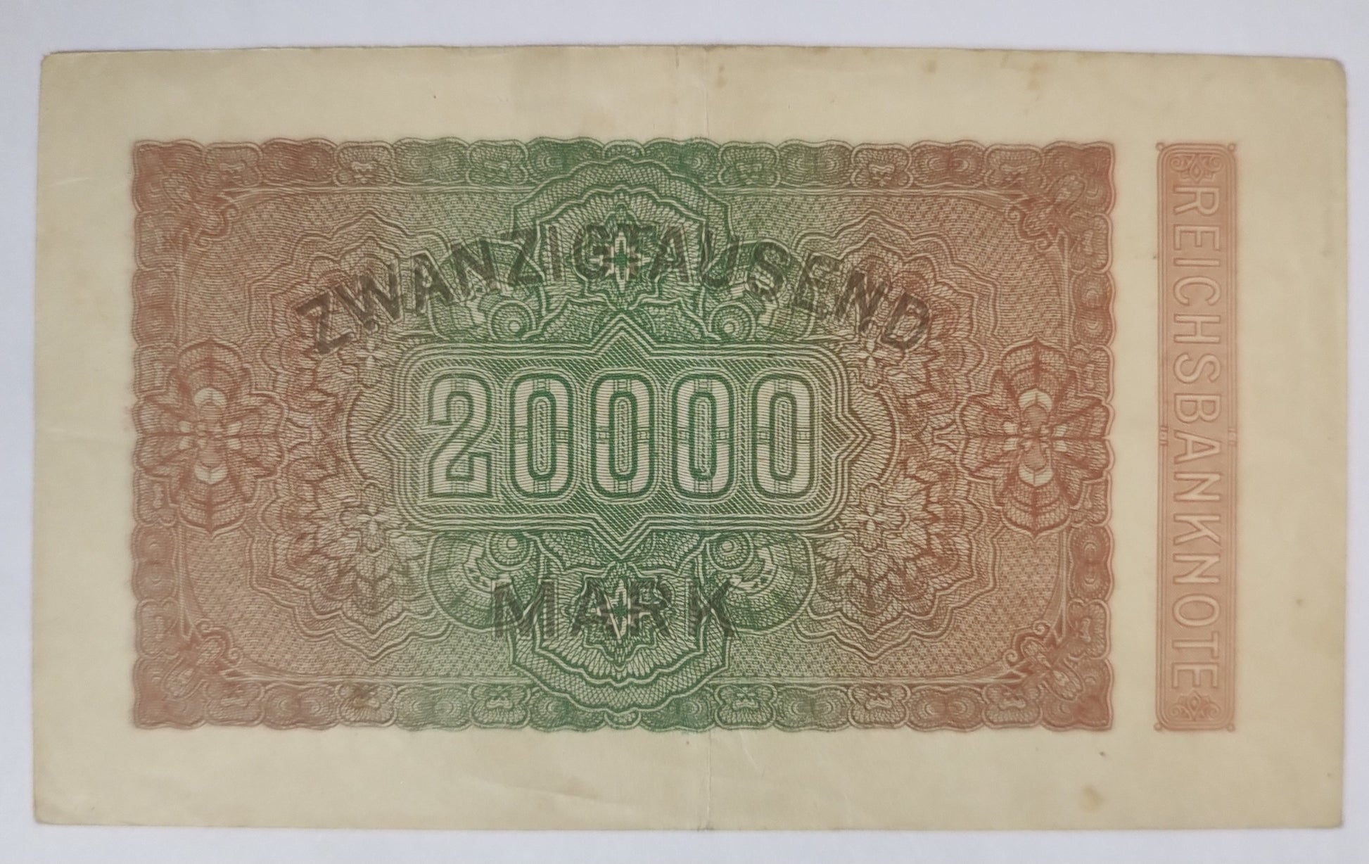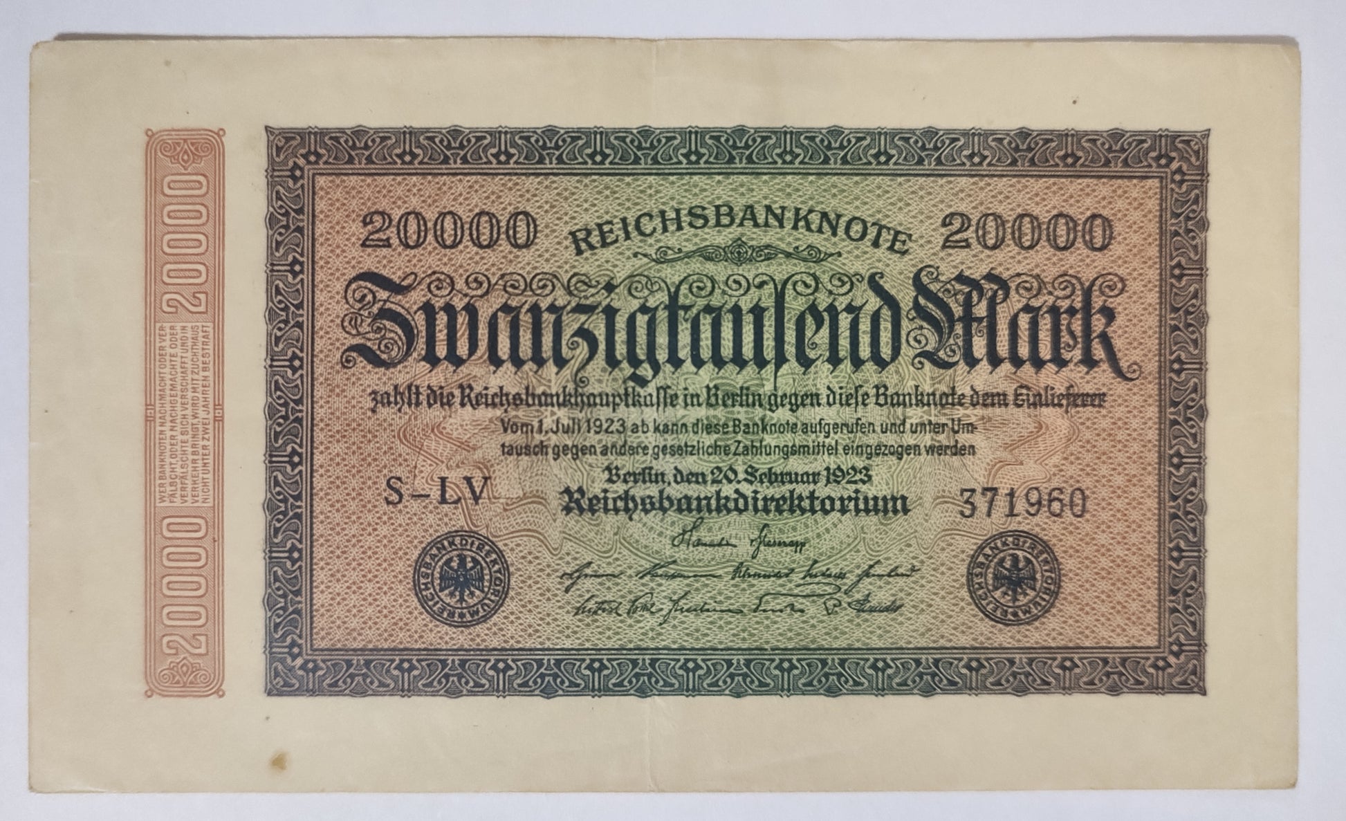 Authentic 1923 German 20,000 Mark Reichsbanknote P85a Series LV from the Weimar hyperinflation period. Historical collectible banknote for currency collectors and history enthusiasts.