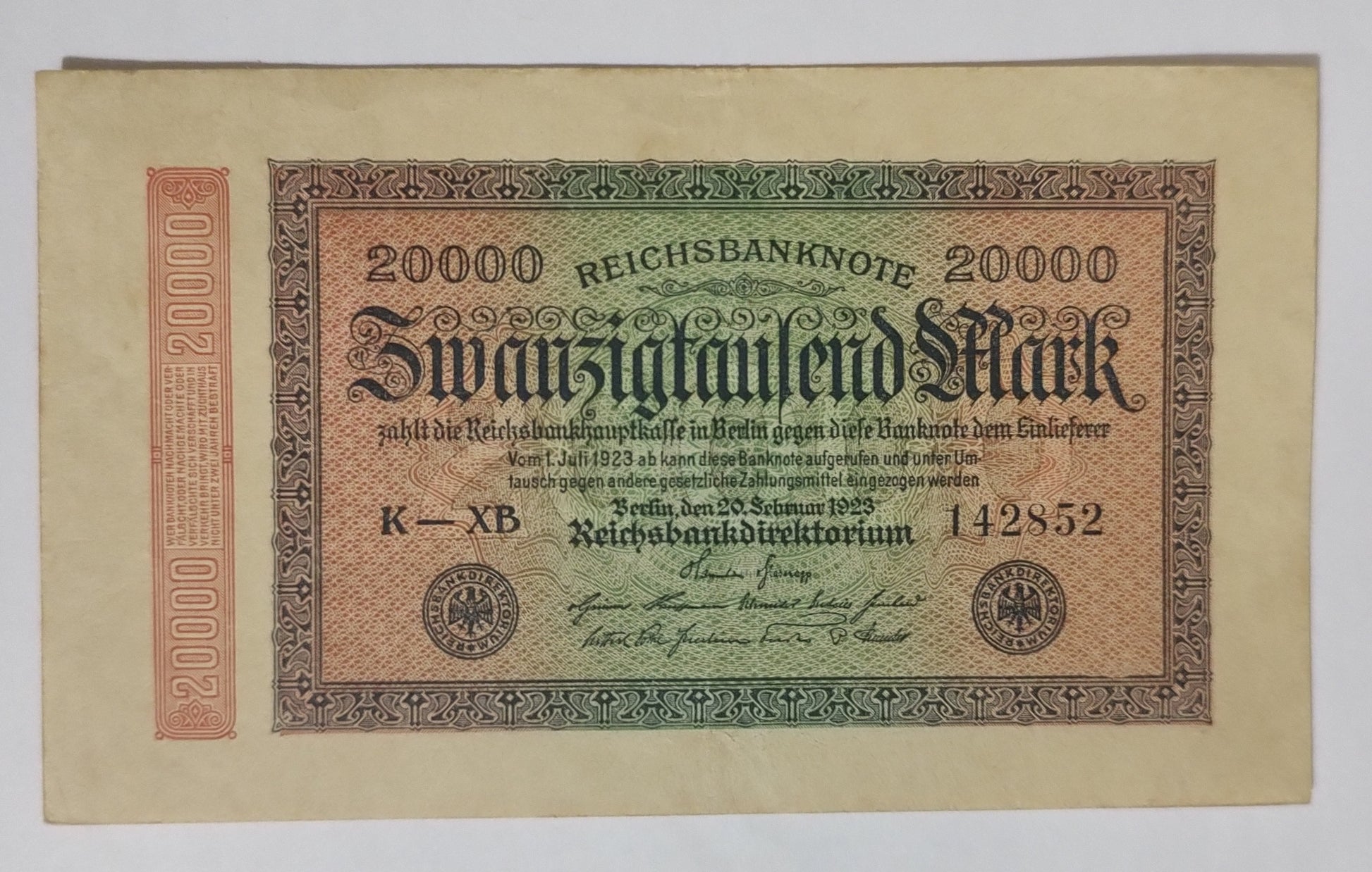 Authentic 1923 German 20000 mark Reichsbanknote P85a, series XB. Hyperinflation-era collectible note. Perfect for currency collectors and history enthusiasts. Shop now.