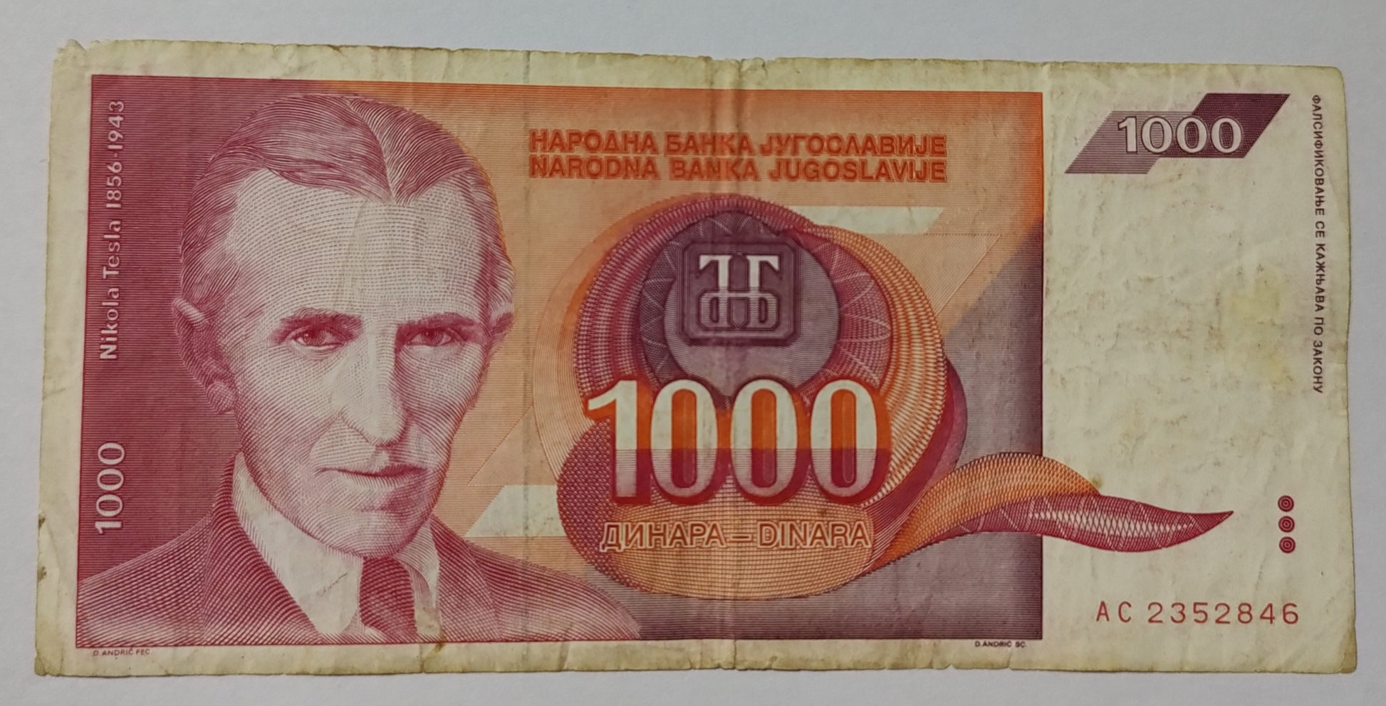 Authentic Yugoslavia 1000 Dinara 1992 banknote (P114) featuring Nikola Tesla. Used condition collectible note from former Yugoslavia. Perfect for currency collectors and history enthusiasts.